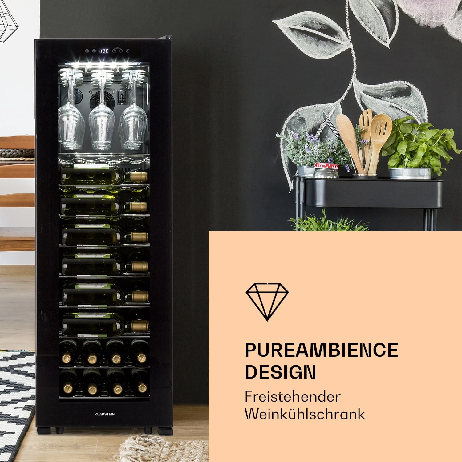 Edles Design für stilvolle Präsentation: Der Klarstein Bellevin 62 Single-Zone-Weinkühlschrank zeigt im PureAmbience Design was er hat! Damit ist er der Kühlschrank der Wahl für alle passionierten Weinliebhaber, Bars oder Caterer, die nicht nur großen Kühlbedarf haben, sondern auch mit Präsentation überzeugen wollen. Neben der modernen, doppelt verglasten Panoramatür trumpft der Bellevin 62 vor allem durch sein luxuriöses, schwarzes Gehäuse, die LED-Innenbeleuchtung sowie einen integrierten Weinglasträger auf. So bereichert er nicht nur Wohnlandschaften und Küchenzeilen, sondern hebt die Weinbestände bei jedem Anlass passend hervor – Willkommen in der Profiliga der Weinlagerung!