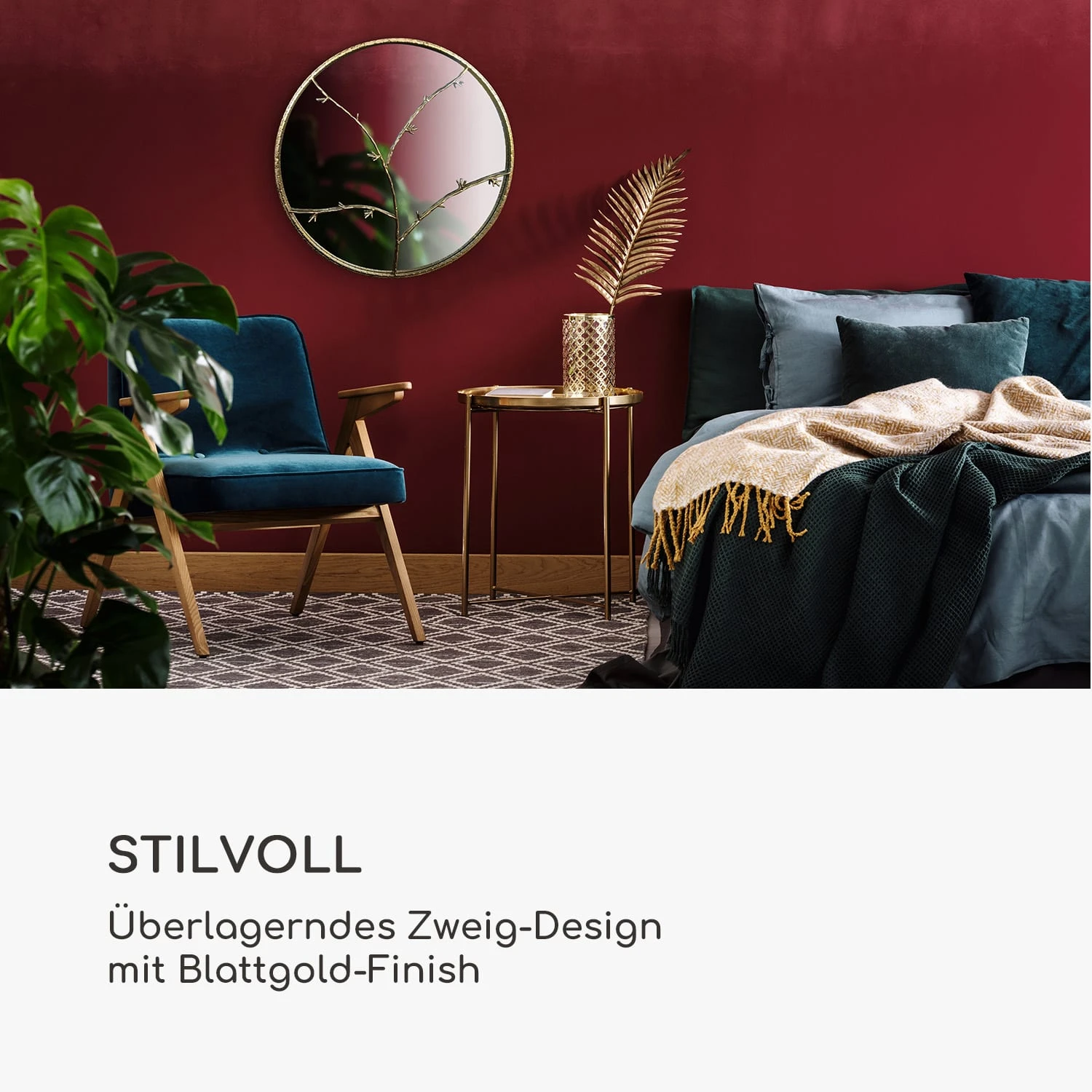Aufwendig gearbeitet, edle Materialien und ein extravaganter Look: Das ist der Berkeley Wandspiegel von Casa Chic by blumfeldt. Aus seinem Metallrahmen wachsen Zweige über die Spiegelfläche und bilden ein einzigartiges Muster. Das Zweig-Design mit handbemaltem Blattgold-Finish erzeugt einen aussagekräftigen Look, der sofort ins Auge sticht. Ob im Wohn-, Schlafzimmer oder im Eingangsbereich aufgehängt, der Berkeley setzt überall gekonnt ein Statement. Der runde Akzent-Spiegel ist feuchtigkeits- und anlaufbeständig, damit eignet er sich ebenfalls zu Verwendung im Badezimmer.