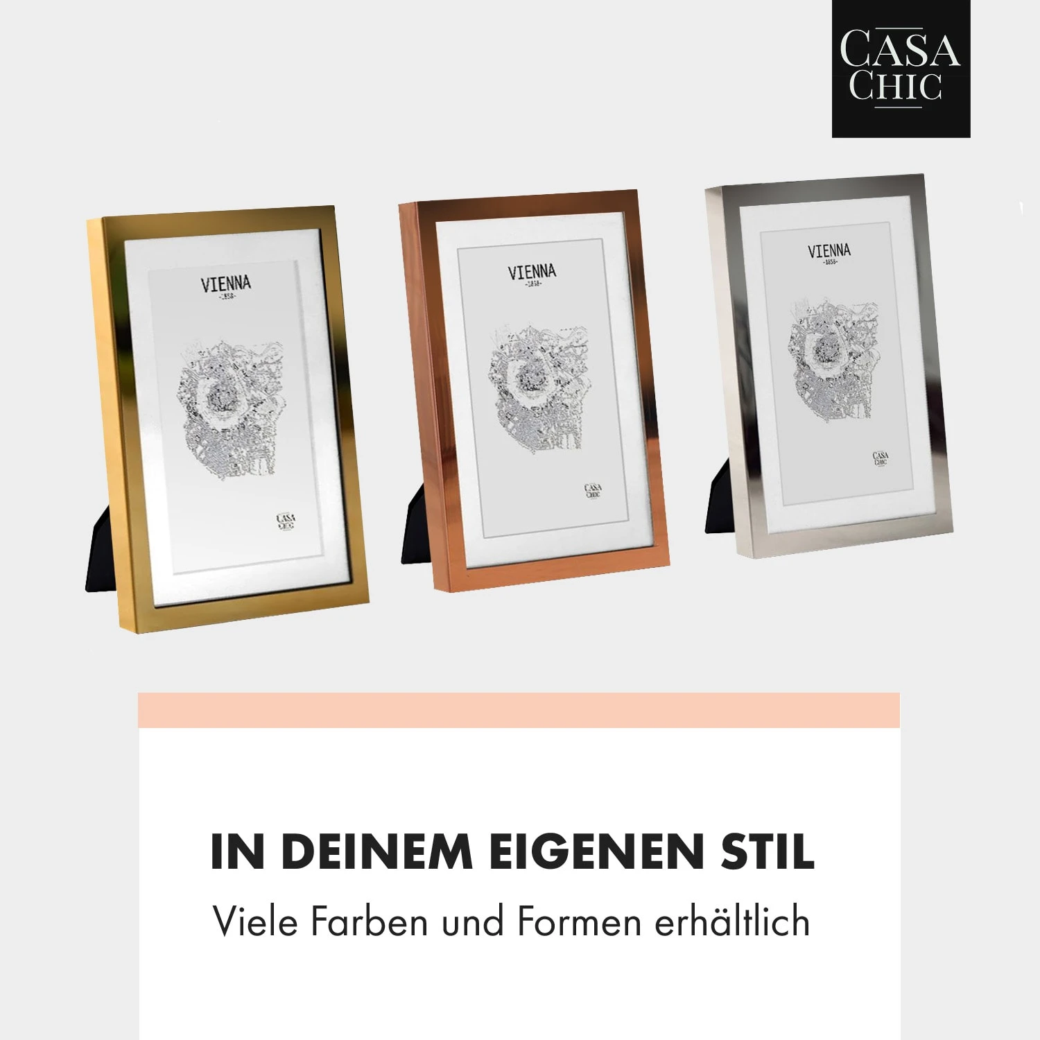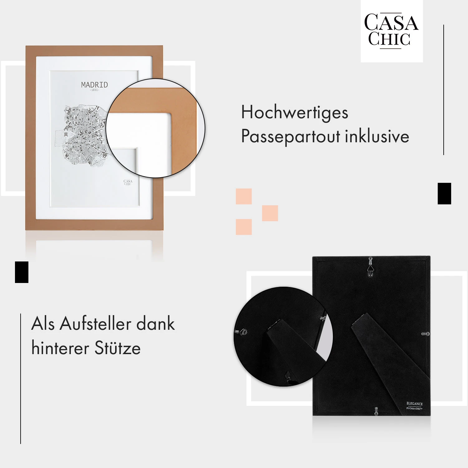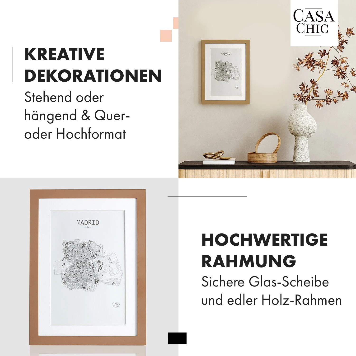 Die Casa Chic by blumfeldt Berwick Bilderrahmen bringen eine neue Eleganz in dein Zuhause. Setze deine Lieblingsfotos – mit oder ohne Passepartout – gekonnt in Szene: Als Aufsteller im Hoch- oder Querformat oder als klassischer Wandbilderrahmen. Hinter seiner Echtglasscheibe wird jedes Bild zum Hingucker. Die hochwertige Halterung auf der Rückseite gestaltet das Einlegen oder Austauschen der Bilder besonders einfach.