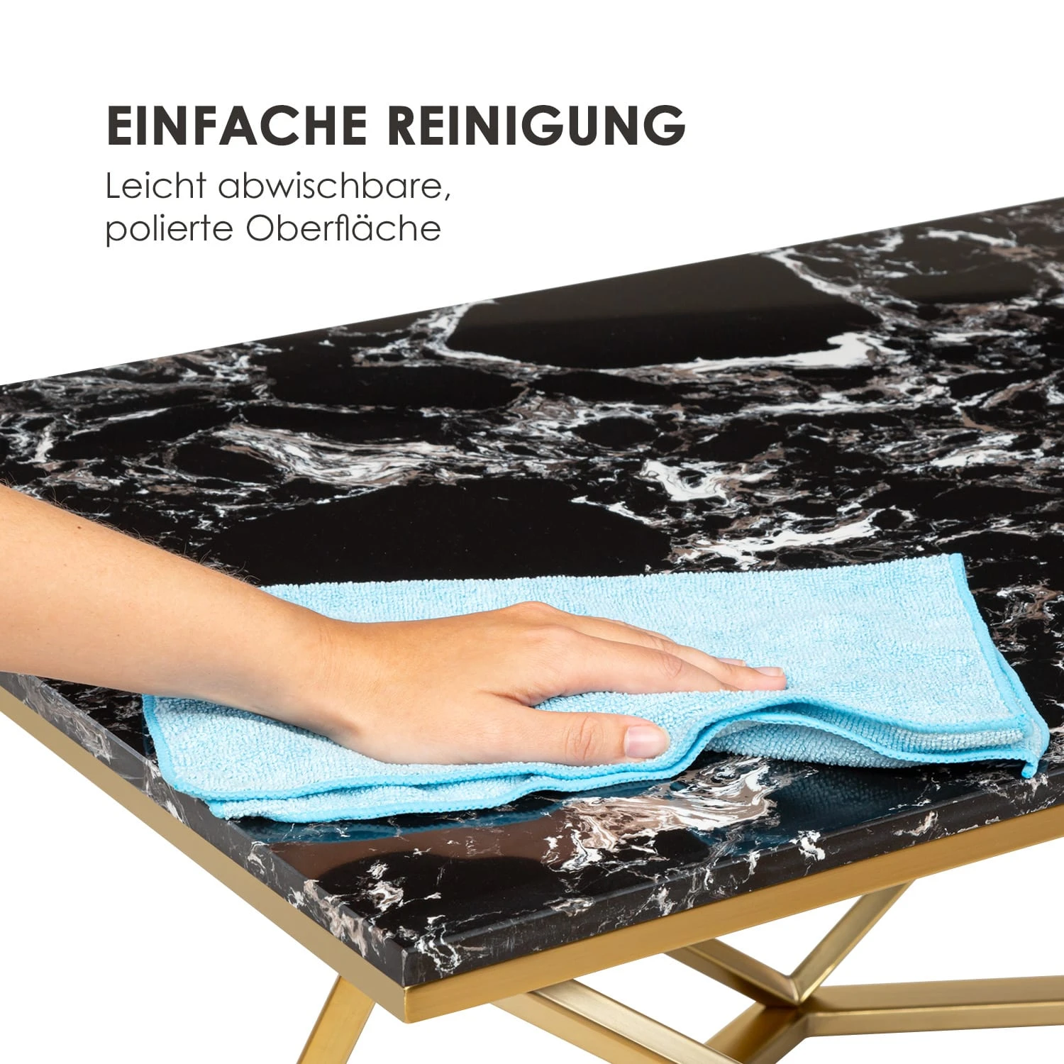 Zeitlose Eleganz ist der Anspruch des Besoa Black Onyx I Beistelltisches. Seine glatt polierte Tischplatte aus schwarzem Marmor mit weißer Bänderung erweckt den Luxus des Sonnenkönigs bei Ihnen zuhause. Die edle Tischplatte wird durch das goldfarbene Metallgestell zusätzlich unterstrichen. Dabei bleibt der Couchtisch in seiner Formensprache modern und schnörkellos, sodass er sich perfekt in Ihr Wohnambiente einfügt. Mit seinen praktischen Maßen von 110 x 42,5 x 55 cm eignet sich der Black Onyx I ideal als Couch- oder Beistelltisch.