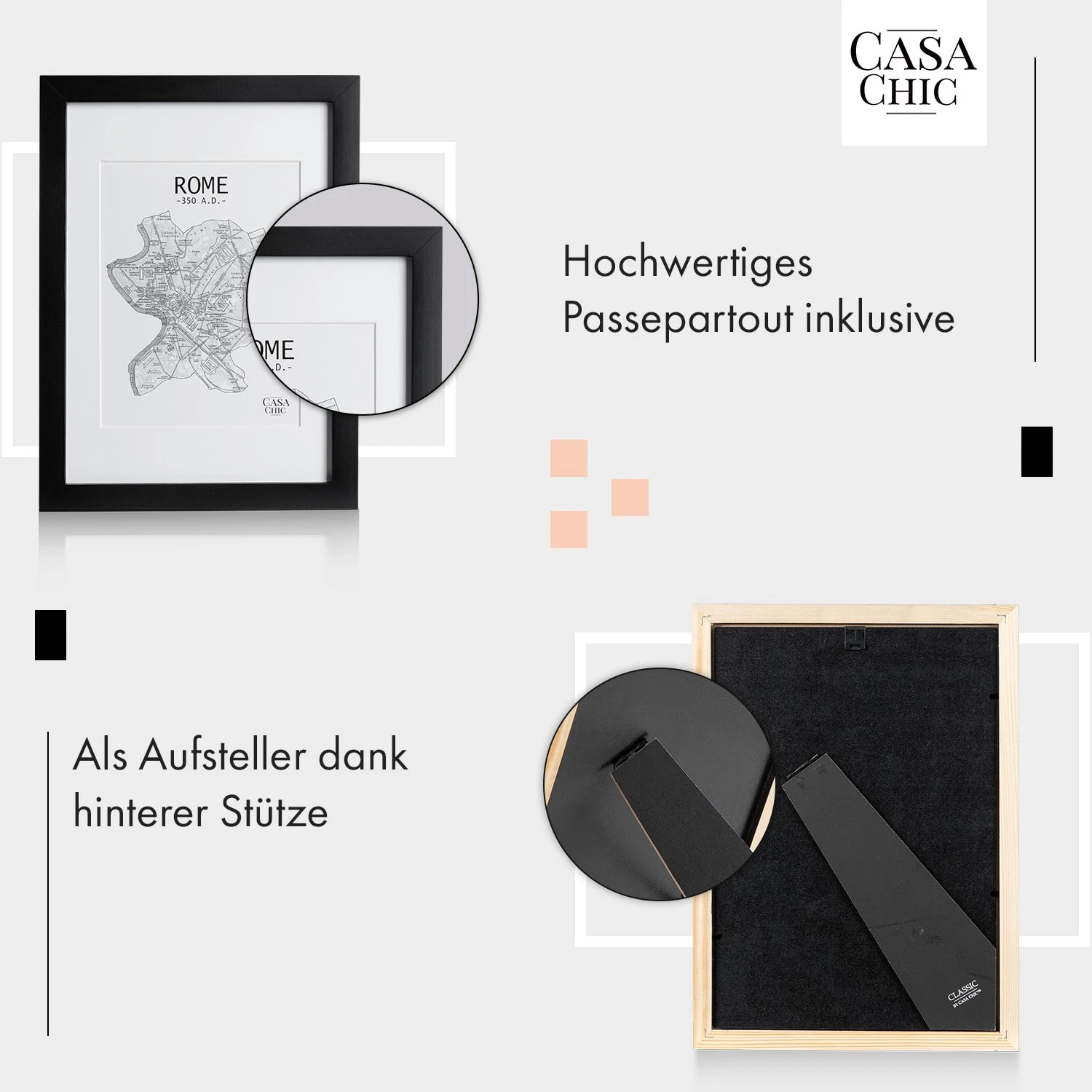 Der exklusive Bilderrahmen Brighton von Casa Chic by blumfeldt gibt jedem Bild den perfekten Rahmen. Hier verbindet sich hochwertige Qualität aus Handarbeit mit besonders stilvollem Design. Hinter echtem Glas finden Kunstobjekte, Drucke oder Fotografien optimalen Schutz vor Staub, Feuchtigkeit und Licht. Die Tiefe des Brighton Bilderrahmens hebt dabei deine Bilder in jedem Raum wundervoll hervor und das breite Rahmenprofil wird zum eleganten Kontrast. Den hochwertigen Fotorahmen kannst du sowohl im Quer- als auch im Hochformat nutzen und ist an der Rückseite mit einem Aufsteller und einer Aufhängung versehen. Ohne Passepartout ist er passend für das Bildformat DIN A4 (21 x 29,7 cm), daher wundervoll für Zeugnisse oder Zertifikate geeignet. Hinter dem dazugehörigen Passepartout kannst du Fotos und Bilder mit einem Format von 15 x 20 cm kunstvoll präsentieren.