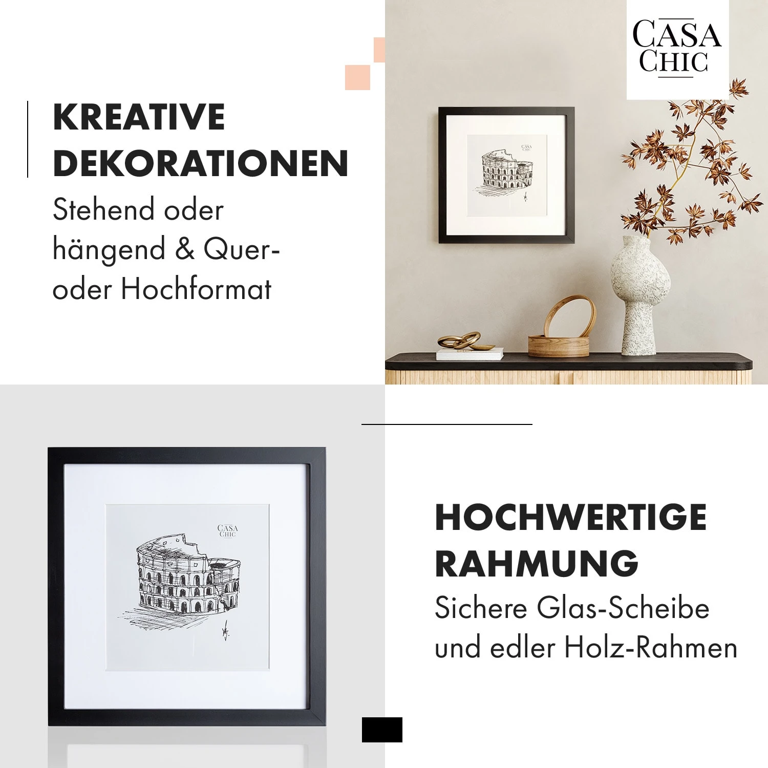 Setze Fotos und Bilder gekonnt in Szene: Die exklusive Cannon Bildeinfassung von Casa Chic by blumfeldt schenkt jedem Foto den perfekten Rahmen – mit oder ohne Passepartout. Hier vereinen sich hochwertige Handarbeit und ein stilvoller Look zu einem ganz besonderen Design. Das bruchfeste Sicherheitsglas schützt deine Kunstobjekte, Drucke oder Fotografien optimal vor Schmutz und Staub. Dank seines 2 x 2 cm starken Rahmenprofils hängt der Cannon bündig an der Wand. Natürlich macht der Fotorahmen auch als Aufsteller auf deinem Sideboard eine klasse Figur.