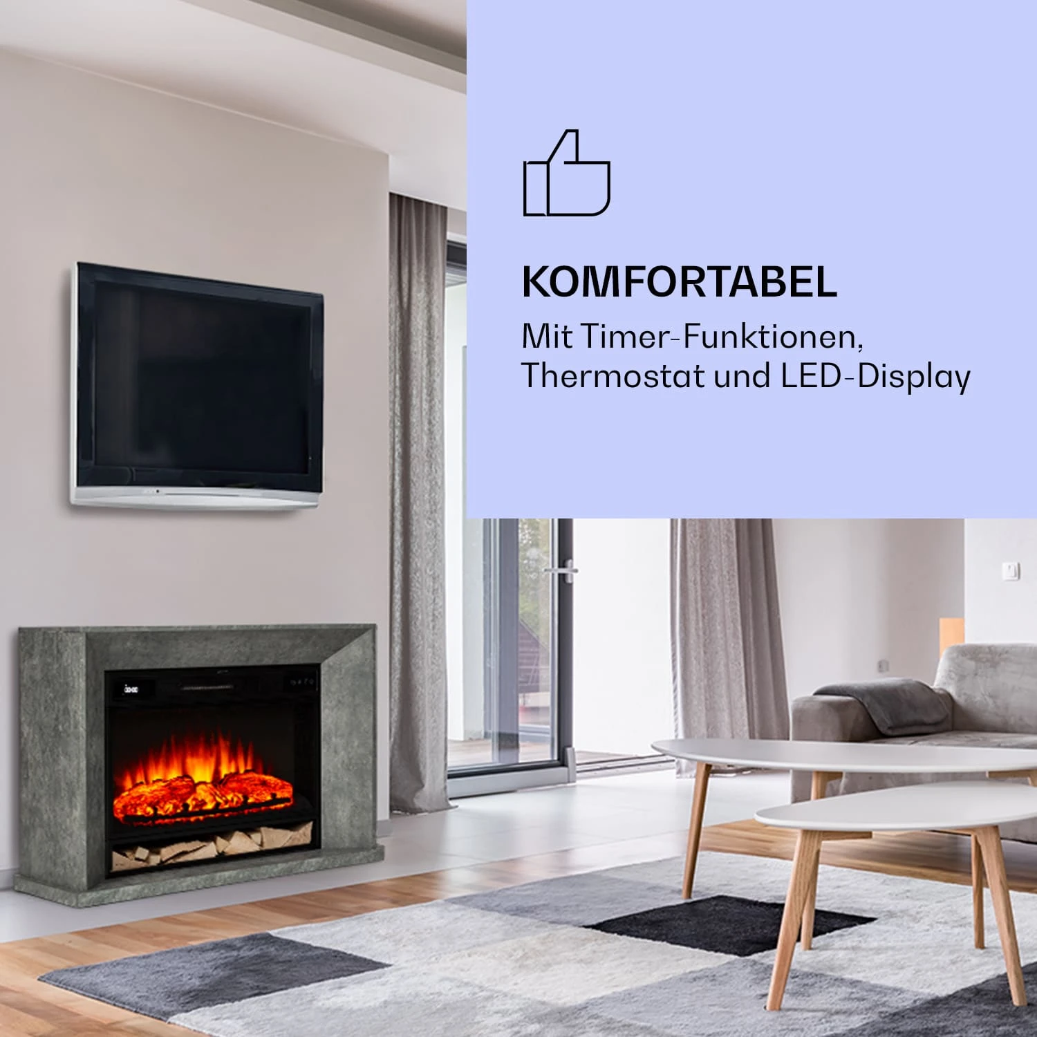 Gemütliche Atmosphäre zu jeder Jahreszeit: Genieße mit dem Klarstein Crater Lake Elektrokamin ein Flammenspiel ohne Rauch oder Feuer. Lass dich von der realistischen Feueroptik verzaubern und entspanne gemeinsam mit Partner oder Partnerin, Freunden oder der Familie an deinem neuen Lieblingsplatz. Ganz nach Wunsch kannst du die LED-Flammen in 4 Helligkeitsstufen leuchten lassen. An kühleren Tagen sorgt die zuschaltbare Heizfunktion für ein warmes Zuhause. Gesteuert wird der Crater Lake ganz bequem per Fernbedienung oder über das Touch-Bedienfeld am Gerät. Besonderen Komfort bieten die automatische Ausschalt- sowie die Wochentimer-Funktion.