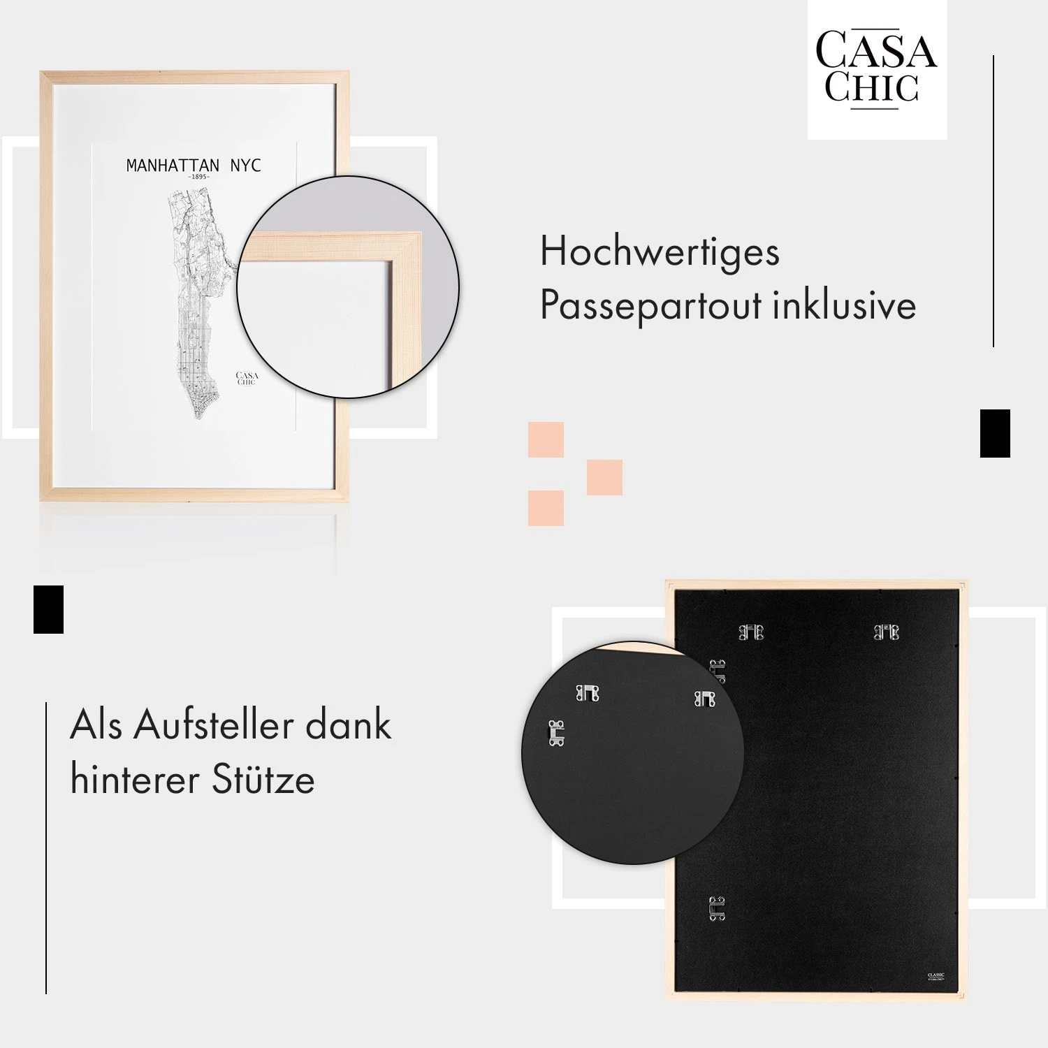 - Aufsteller und Aufhängung bereits am Rahmen montiert