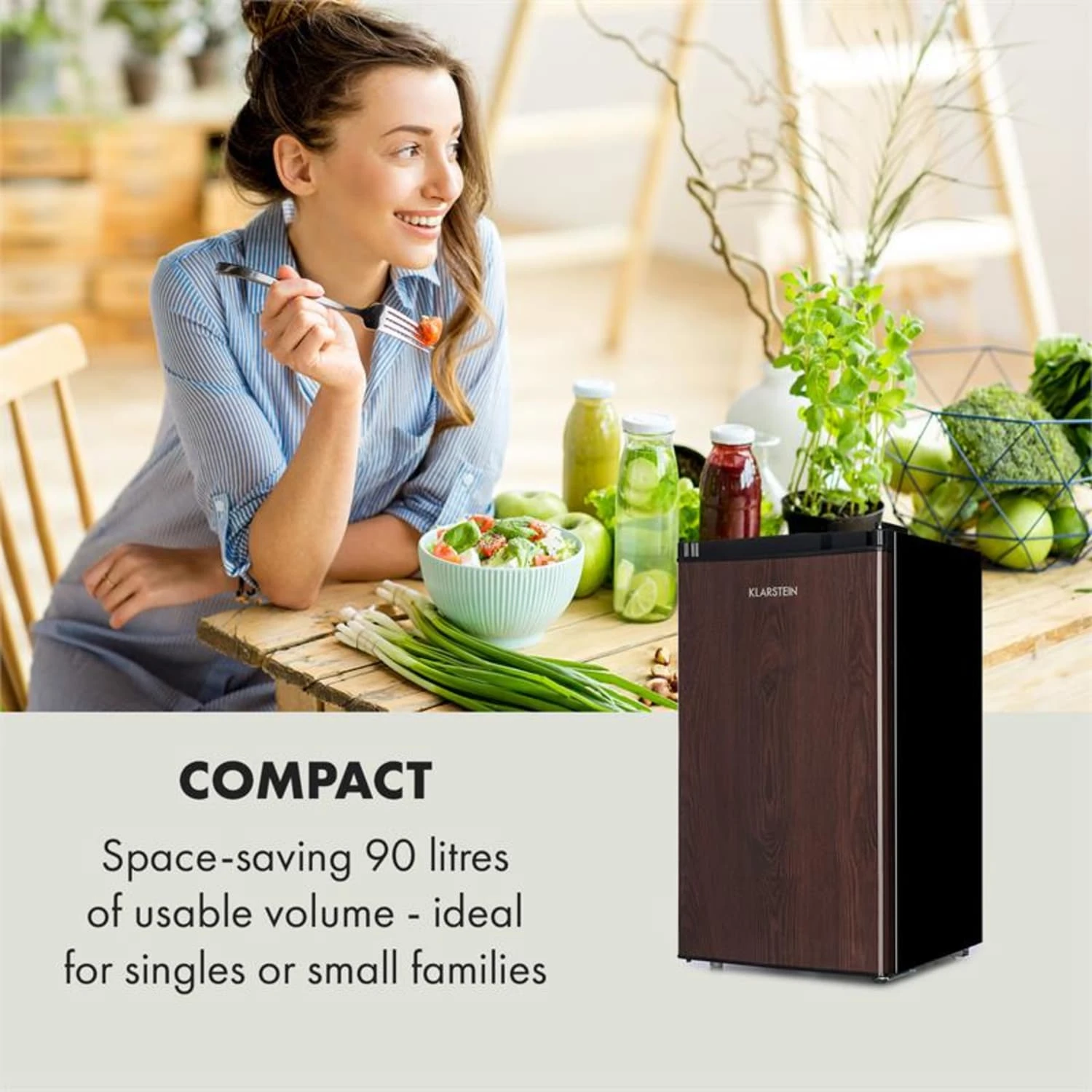 Rustikaler Küchencharme im Kompaktdesign! Der Klarstein Feldberg Kühlschrank ist nicht nur sparsam in Sachen Platz- und Energiebedarf, er begeistert auch durch sein Äußeres. Sein Design im MirageCool Concept belebt nicht nur die Küche, sondern auch alle anderen Wohnambientes mit einem schlicht eleganten Holz-Design Print.