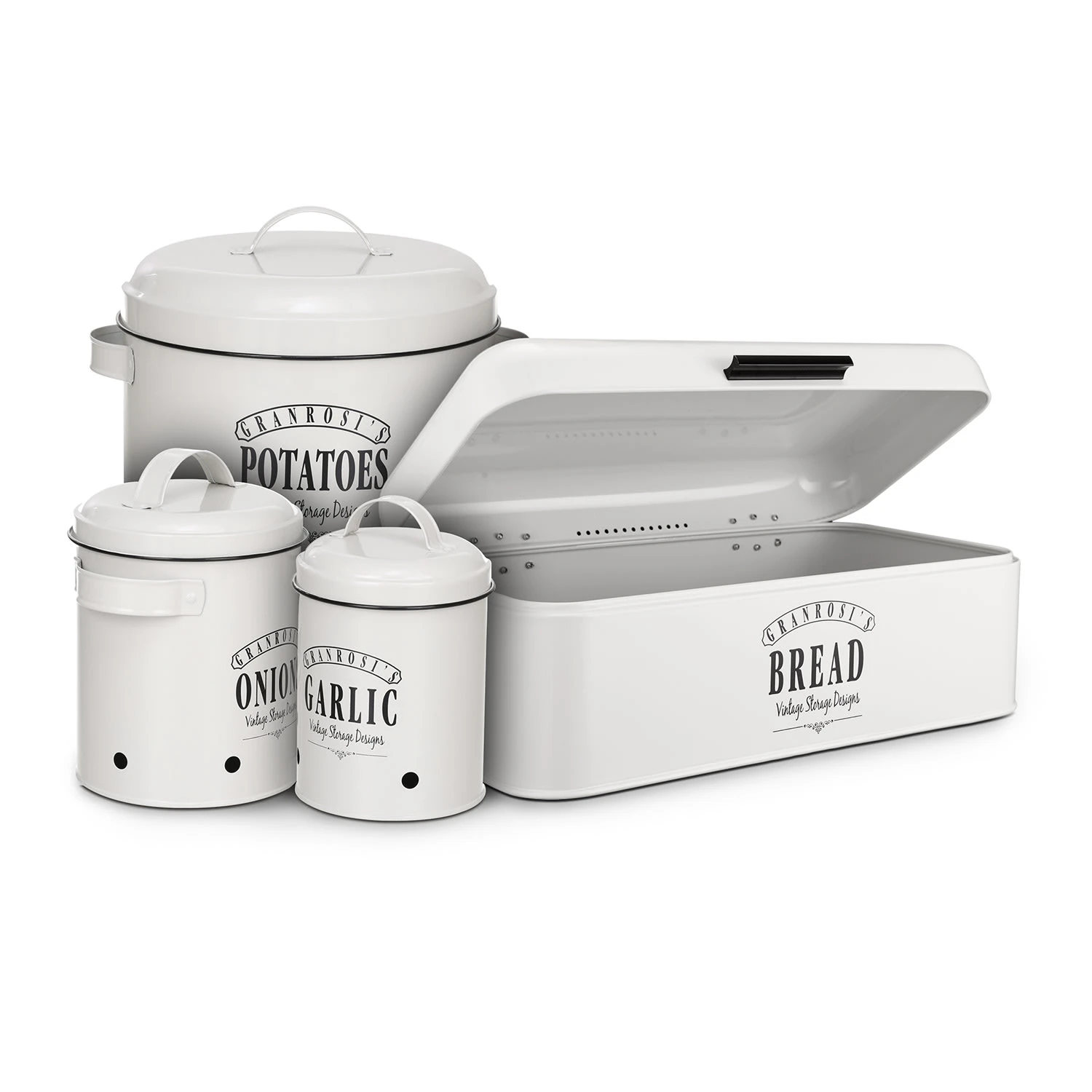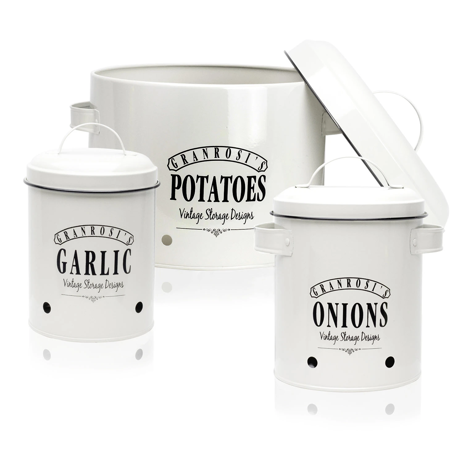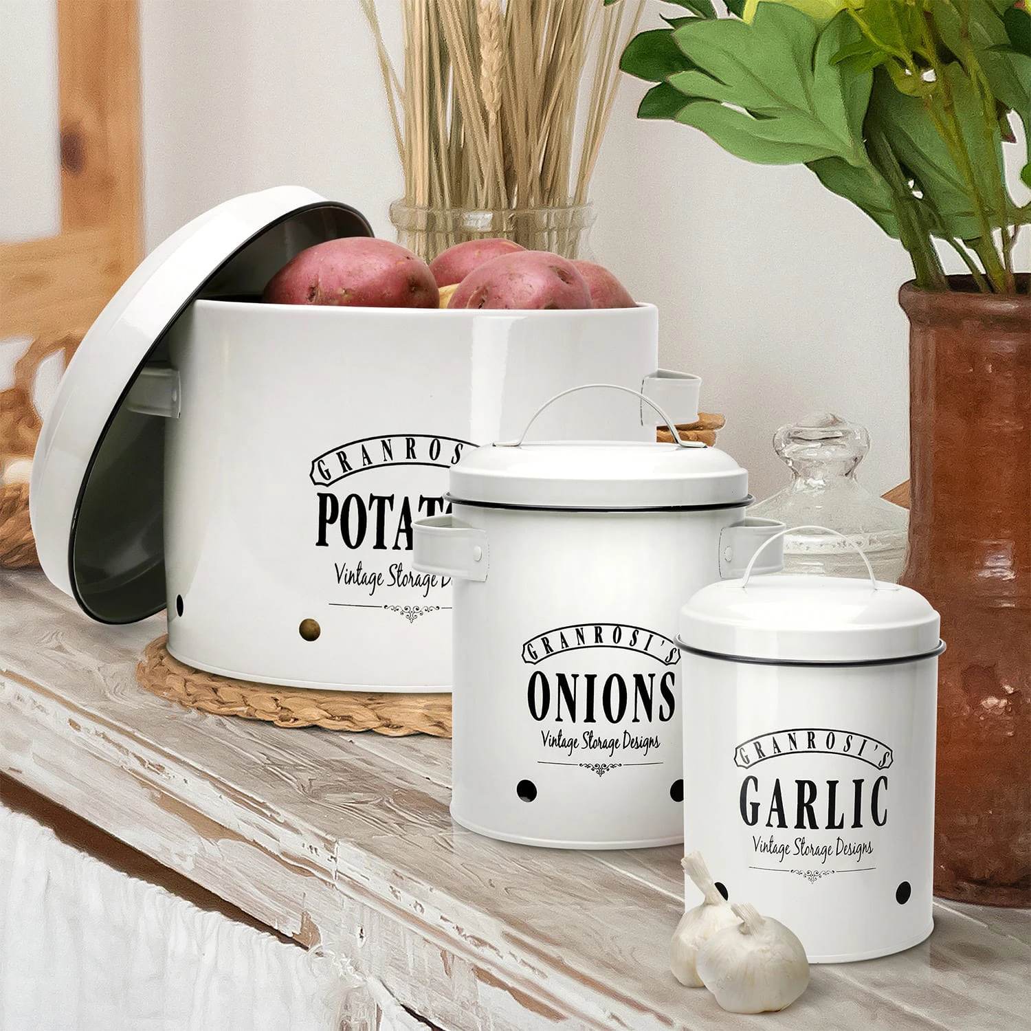 Die Georgia Vintage-Vorratsbehälter verleihen deiner Küche das gewisse Etwas und sind eine Bereicherung für jeden Haushalt: Bestehend aus insgesamt 3 x Klarstein Vorratsdosen für Knoblauch (12 x 18 cm (ØxH)), Zwiebeln (17 x 22,5 x 14 cm (BxHxT)) und Kartoffeln (27 x 21 x 23,5 cm (BxHxT)).