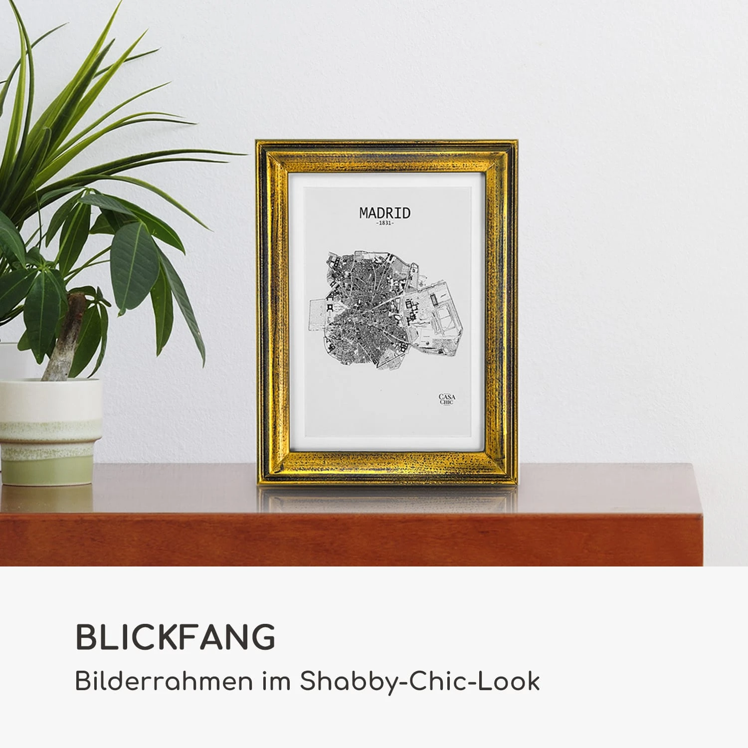 Jeder Rahmen ist ein Unikat: Der Lancaster Bilderrahmen von Casa Chic by blumfeldt aus edlem Pinienholz im Shabby-Chic-Look ist handgearbeitet und bringt deine Fotos und Bilder sowohl im Hoch- als auch im Querformat ideal zur Geltung. Bleibe flexibel und gestalte wunderschöne Wandcollagen oder arrangiere deine Lieblingsfotos auf dem Sideboard oder im Regal. Das mitgelieferte Passepartout überlässt dir die Wahl des passenden Bildausschnitts. Das gleichmäßig breite Rahmenprofil und die Frontscheibe aus Echtglas sorgen für Eleganz und besten Schutz.