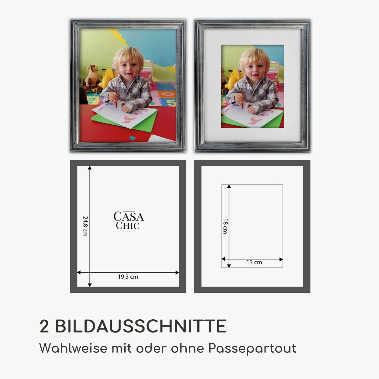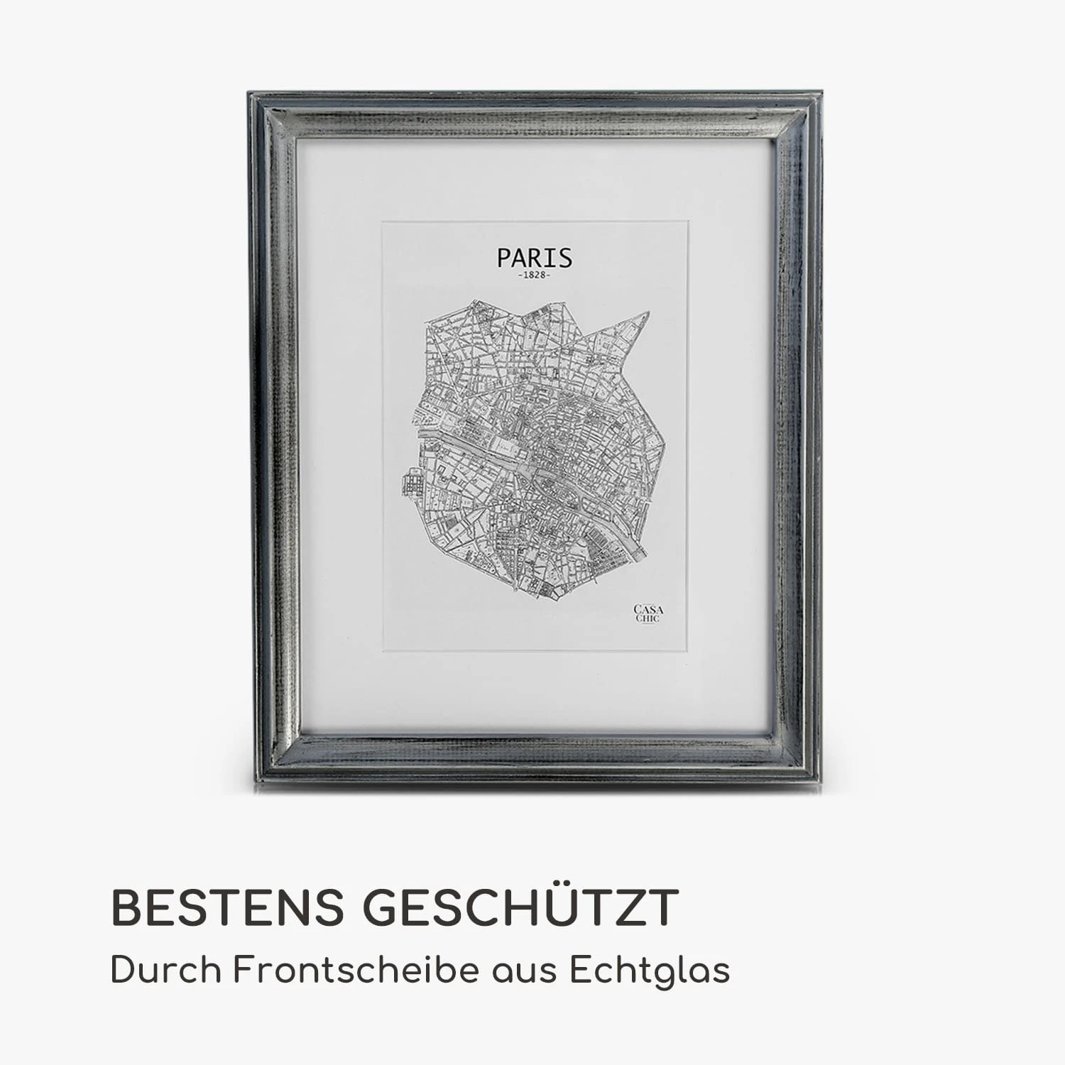 Jeder Rahmen ist ein Unikat: Der Lancaster Bilderrahmen von Casa Chic by blumfeldt aus edlem Pinienholz im Shabby-Chic-Look ist handgearbeitet und bringt deine Fotos und Bilder sowohl im Hoch- als auch im Querformat ideal zur Geltung. Bleibe flexibel und gestalte wunderschöne Wandcollagen oder arrangiere deine Lieblingsfotos auf dem Sideboard oder im Regal. Das mitgelieferte Passepartout überlässt dir die Wahl des passenden Bildausschnitts. Das gleichmäßig breite Rahmenprofil und die Frontscheibe aus Echtglas sorgen für Eleganz und besten Schutz.