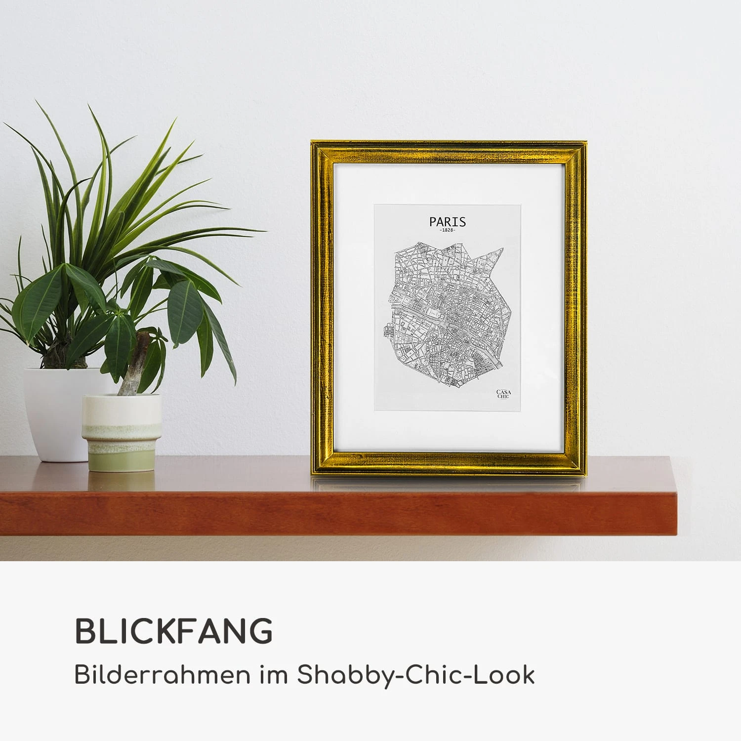 Jeder Rahmen ist ein Unikat: Der Lancaster Bilderrahmen von Casa Chic by blumfeldt aus edlem Pinienholz im Shabby-Chic-Look ist handgearbeitet und bringt deine Fotos und Bilder sowohl im Hoch- als auch im Querformat ideal zur Geltung. Bleibe flexibel und gestalte wunderschöne Wandcollagen oder arrangiere deine Lieblingsfotos auf dem Sideboard oder im Regal. Das mitgelieferte Passepartout überlässt dir die Wahl des passenden Bildausschnitts. Das gleichmäßig breite Rahmenprofil und die Frontscheibe aus Echtglas sorgen für Eleganz und besten Schutz.
