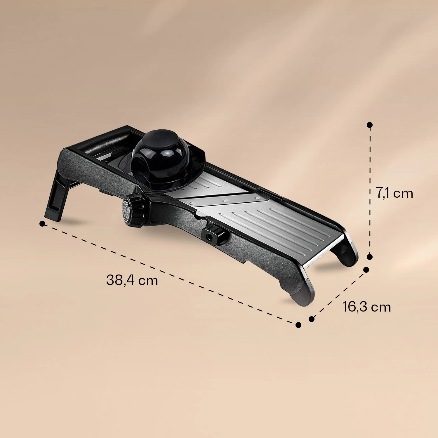 Du willst Zeit bei den Vorbereitungen in der Küche sparen und dein Gemüse schnell, einfach und sicher zerkleinern? Dann ist der Mandoline Küchenhobel von Gramercy by Klarstein genau dein neuer Lieblingsküchenhelfer. Durch seine ultrascharfe Klinge gleitet er auch durch harte Gemüsesorten wie Kartoffeln oder Kürbisse leicht und präzise. Dabei musst du keine Angst um deine Finger haben, denn der Mandoline Gemüseschneider kommt mit praktischem Gemüsehalter und schnittfesten Sicherheitshandschuhen zu dir nach Hause. Am seitlichen Drehknopf stellst du ganz bequem die gewünschte Scheibendicke von hauchdünn bis 9 mm ein. Zusätzlich kannst du mit dem Mandoline dein favorisiertes Gemüse auch in formschöne Julienne-Streifen bringen. Für die sichere und komfortable Reinigung wird eine passende Reinigungsbürste direkt mitgeliefert. Anschließend kannst du die Mandoline Schneidemaschine zusammenklappen und platzsparend in Schublade oder Schrank verstauen.