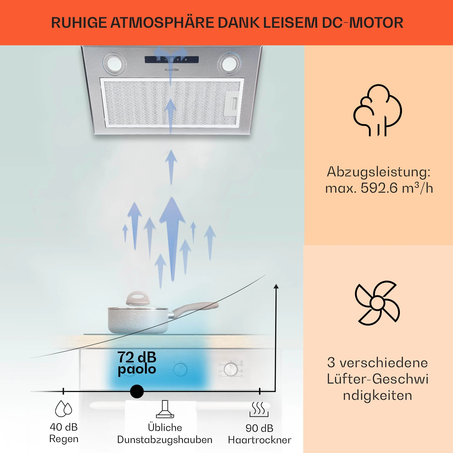 Beste Luft in der Küche: Die Klarstein Paolo Dunstabzugshaube verschwindet randlos in der Küchenhänge. Von dort beseitigt sie schwungvoll Dampf und Dunst beim Kochen – mit 200 Watt Motorleistung, drei Geschwindigkeiten und bis zu 593 m³/h Abluftleistung. Per unkomplizierter Touch-Bediensektion kannst du Lüftung und Beleuchtung steuern und ein Abschalttimer lüftet auf Wunsch für 1 bis 9 Minuten nach und schaltet das Gerät danach ab.