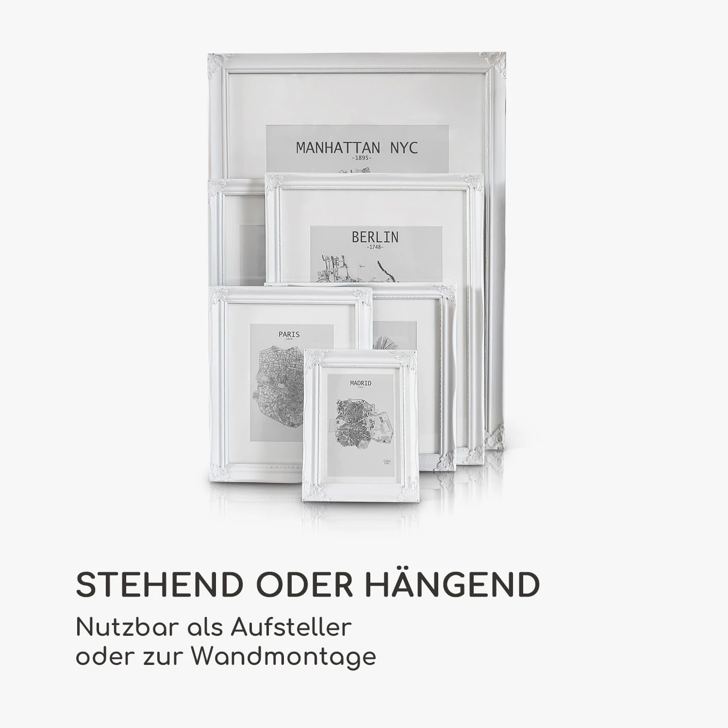 Die Regent Bilderrahmen von Casa Chic by blumfeldt sind aus Echtholz gefertigt und mit Gipsornamenten bestückt. Sie bringen deine Fotos und Bilder sowohl im Hoch- als auch im Querformat ideal zur Geltung. Dabei bildet das aufwendig gestaltet Rahmenprofil im Rokoko-Design einen wunderschönen Kontrast zu modernen Einrichtungen. Gestalte Wandcollagen oder arrangiere deine Lieblingsfotos auf dem Sideboard oder im Regal. Das mitgelieferte Passepartout überlässt dir die Wahl des passenden Bildausschnitts. Die Echtglasscheibe schützt nicht nur vor Staub und Schmutz, sie vervollständigt gekonnt den edlen Look der Regent Rahmen.