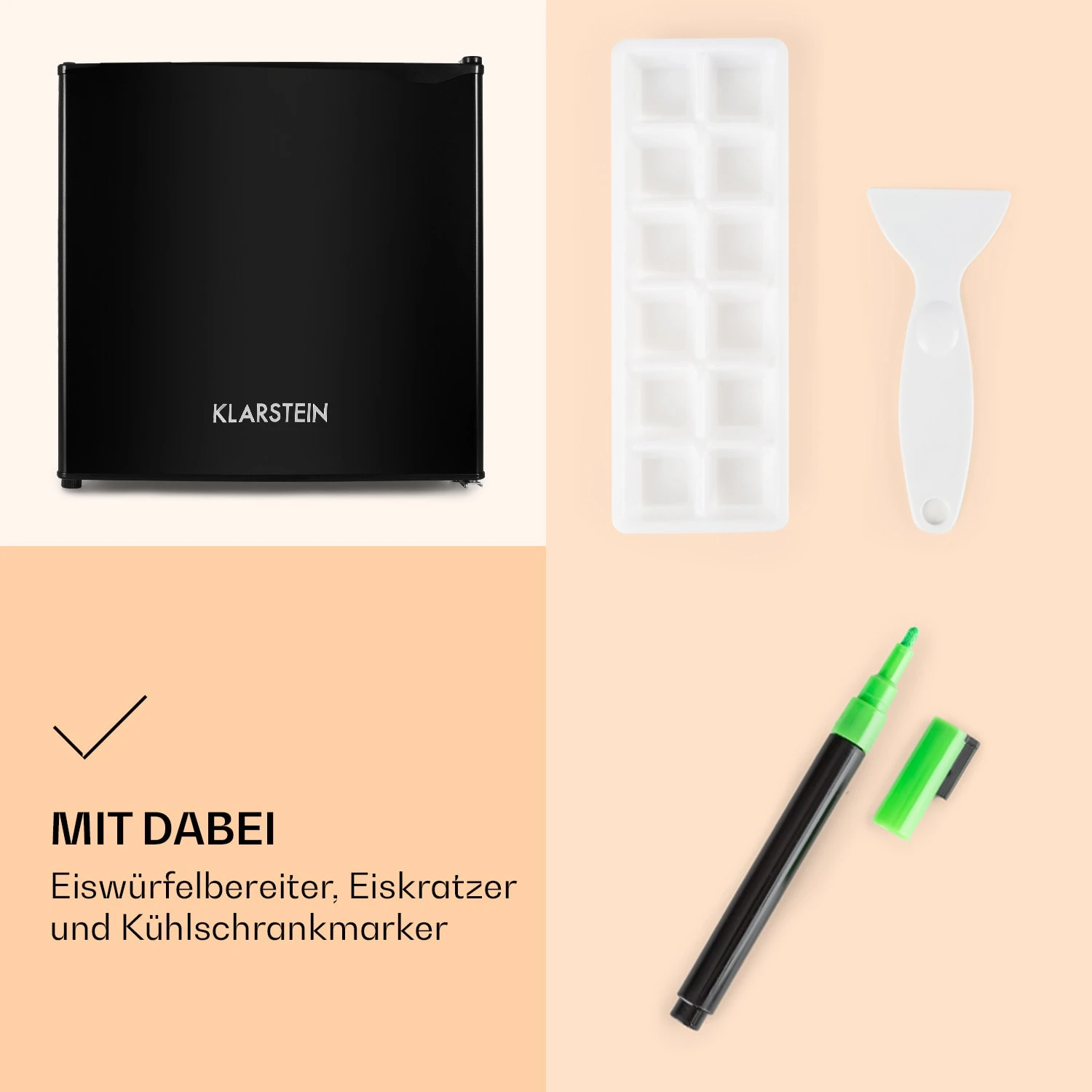 Der Klarstein Spitzbergen Aca ist nicht nur ein Kühlschrank, seine Front-Oberfläche ist wie ein White Board mit geeigneten Markern beschreib- und wieder abwischbar. Sie bietet viel Platz für Einkaufslisten, Notizen oder sogar Liebesbotschaften. Sein geräumiges Kühlfach mit 42 Litern Volumen und das topseitige Gefrierabteil mit 4 Litern bieten viel Platz für deine Lebensmittel. Für Ordnung sorgen 1 Gitterboden und 2 Türfächer. Über einen 5-stufigen Drehregler kannst du die Temperatur individuell einstellen.