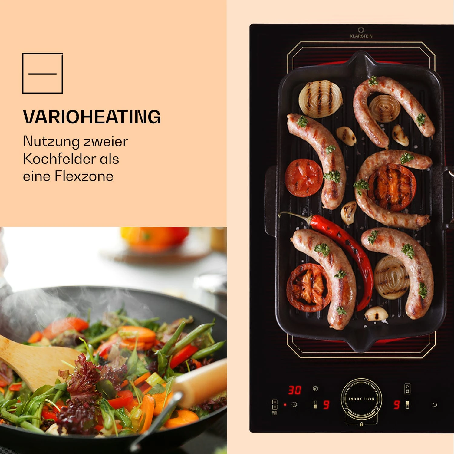 - VarioHeating: nutzt beide Kochzonen als eine Flexzone